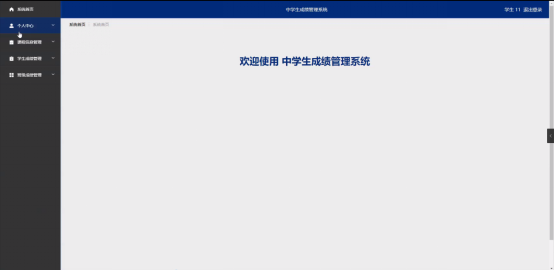 学生进入主页面,主要功能包括对系统首页、个人中心、课程信息管理、学生成绩管理、班级成绩管理等进行操作。学生主页面如图5-9所示: