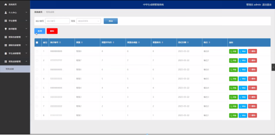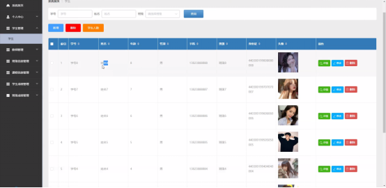 管理员点击学生管理。在学生页面输入学号、姓名和班级进行查询、新增、删除或学生人数学生列表,并根据需要对学生详情信息进行详情、修改或删除操作;如图5-3所示: