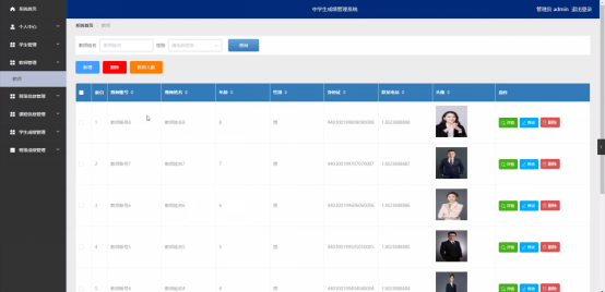 管理员点击教师管理。在教师页面输入教师姓名和选择性别进行查询、新增、删除或教师人数教师列表,并根据需要对教师详情信息进行详情、修改或删除操作;如图5-4所示: