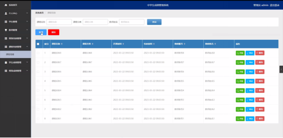 管理员点击课程信息管理。在课程信息页面输入课程名称、课程分类和教师姓名进行查询、新增或删除课程信息列表,并根据需要对课程详情信息进行详情、修改或删除操作;如图5-6所示: