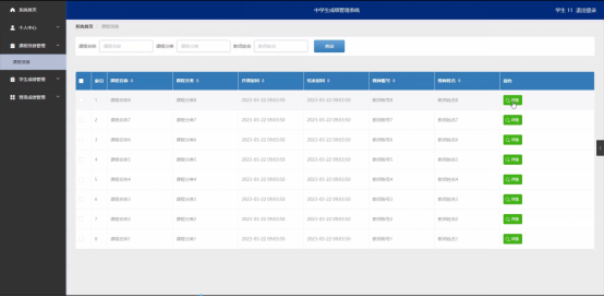 学生点击课程信息管理。在课程信息页面输入课程信息、课程分类和教师姓名进行查询课程信息列表,并根据需要对课程详情信息进行详情操作;如图5-10所示: