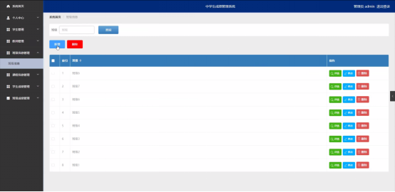 管理员点击班级信息管理。在班级信息页面输入班级进行查询、新增或删除班级信息列表,并根据需要对班级详情信息进行详情、修改或删除操作;如图5-5所示: