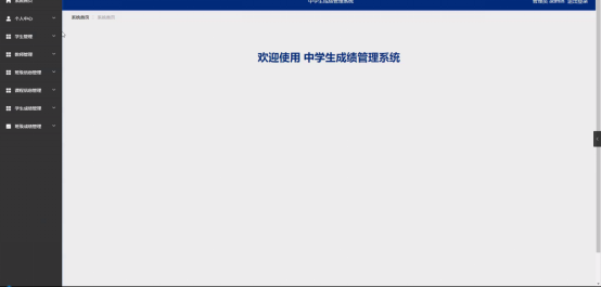 管理员进入主页面,主要功能包括对系统首页、个人中心、学生管理、教师管理、班级信息管理、课程信息管理、学生成绩管理、班级成绩管理等进行操作。管理员主页面如图5-2所示: