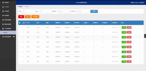 管理员点击学生成绩管理。在学生成绩页面输入姓名、班级、教师姓名和科目名称进行查询、删除、导出或学生成绩列表,并根据需要对学生成绩详情信息进行详情或删除操作;如图5-7所示: