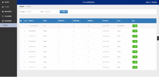 教师点击班级成绩管理。在班级成绩页面输入统计编号和班级进行查询班级成绩列表,并根据需要对课程详情信息进行详情操作;如图5-12示: