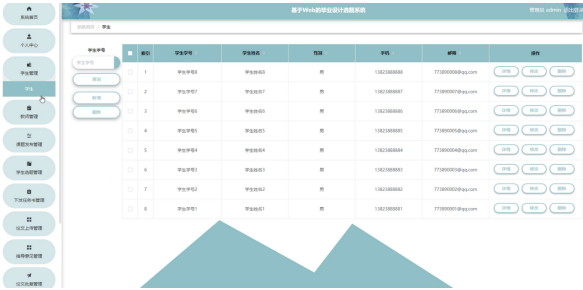 管理员点击学生管理,在学生管理页面对学生学号、学生姓名、性别、手机、邮箱等信息,进行查询,新增或删除学生信息等操作。如图5-9所示: