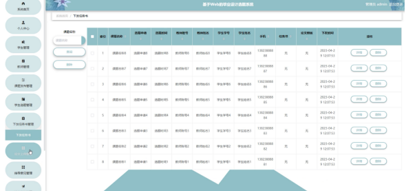 管理员点击下发任务书管理,在下发任务书管理页面对课程名称、选题申请、选题时间、教师账号、教师姓名、学生学号、学生姓名、手机、任务书、论文模块、下发时间等信息,进行查询或删除下发任务书等操作。如图5-13所示:
