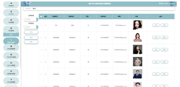 管理员点击教师管理,在教师管理页面对教师账号、教师姓名、性别、联系电话、邮箱、头像等信息,进行查询,新增或删除教师信息等操作。如图5-10所示: