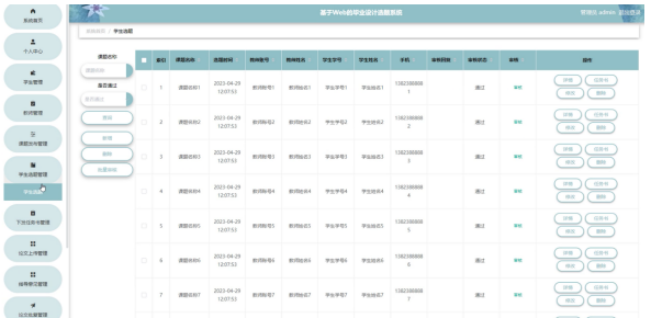 管理员点击点学生选题管理,在学生选题管理页面对课题名称、选题时间、教师账号、教师姓名、学生学号、学生姓名、手机、审核回复、审核状态、审核等信息,进行查询、新增、批量审核或删除学生选题等操作。如图5-12所示: