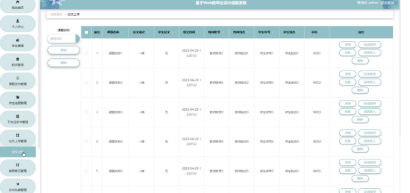管理员点击论文上传管理,在论文上传管理页面对课程名称、论文稿次、学生论文、提交时间、教师账号、教师姓名、学生学号、学生姓名、手机等信息,进行查询或删除论文上传等操作。如图5-14所示: