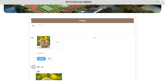 点击在线留言,学生在在线留言板输入留言信息、留言图片,进行留言,留言下方可以查看可查看用户名、回复内容、回复图片,如图5-5所示。