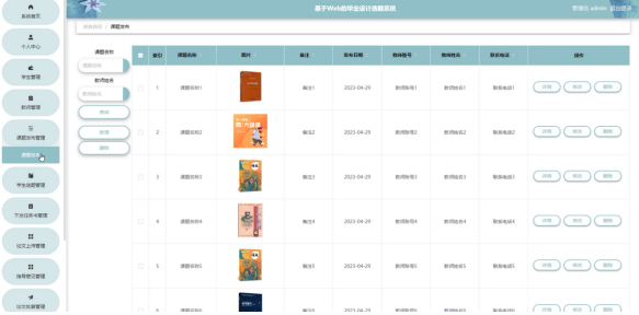 管理员点击课题发布管理,在课题发布管理页面对课题名称、图片、备注、发布日期、教师账号、教师姓名、联系电话等信息,进行查询,新增或删除课题发布等操作。如图5-11所示: