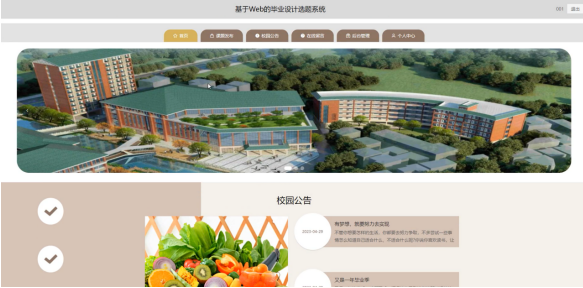 当学生打开系统的网址后,首先看到的就是首页界面。在这里,学生能够看到毕业设计选题系统的导航条显示首页、课题发布、校园公告、在线留言、后台管理、个人中心等。系统首页界面如图5-1所示: