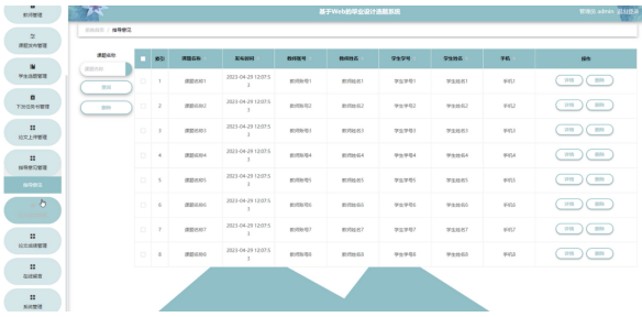 管理员点击指导意见管理,在指导意见管理页面对课程名称、发布时间、教师账号、教师姓名、学生学号、学生姓名、手机等信息,进行查询或删除指导意见等操作。如图5-15所示: