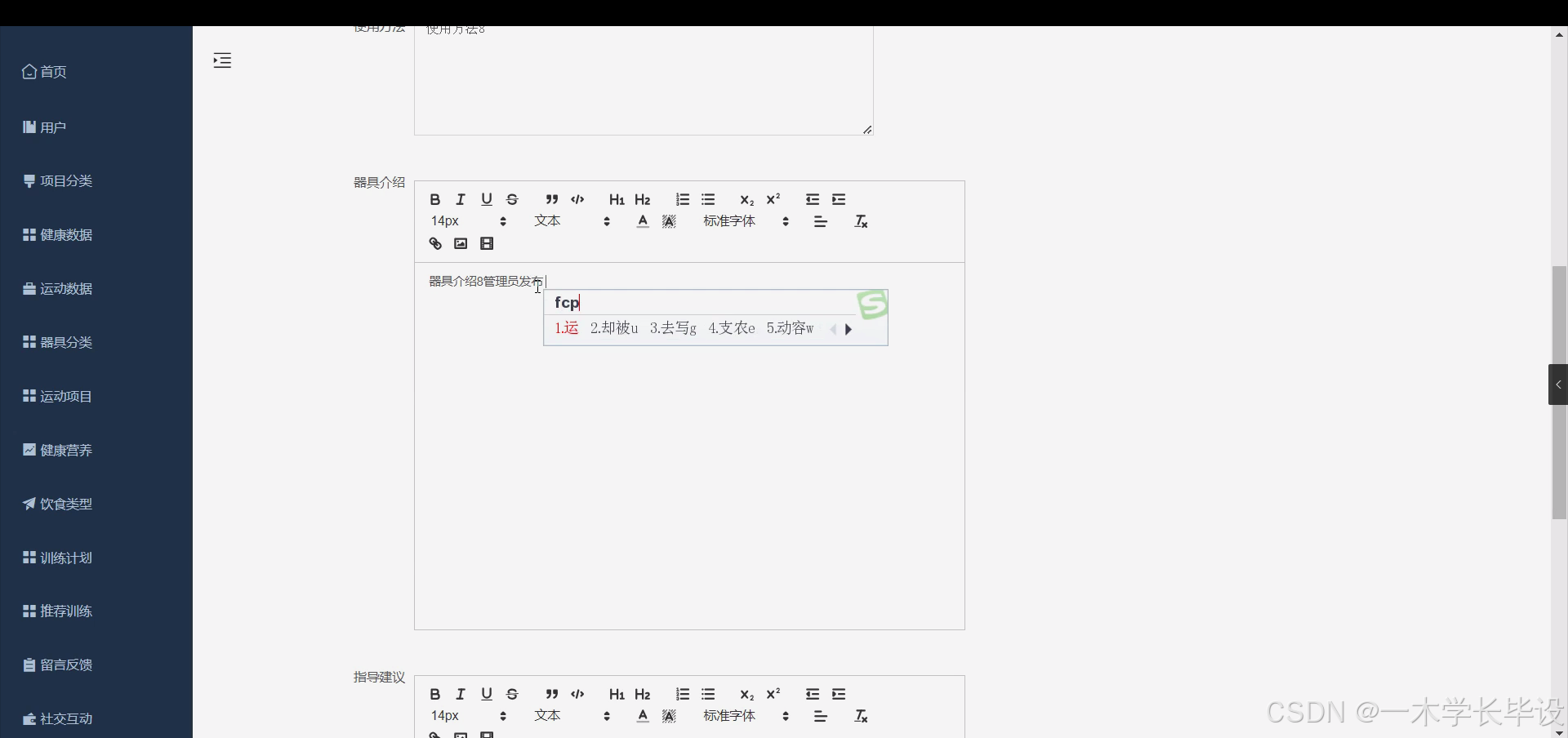 本研究将围绕基于Web的社交运动与健身系统的功能需求展开,具体包括用户信息管理、训练计划制定、项目分类管理、健康数据管理、运动数据记录、器具分类与选择、运动项目推荐、健康营养指导、饮食类型建议、推荐训练课程等多个方面。在用户信息管理方面,系统将实现用户注册、登录、个人信息编辑等功能;训练计划制定则根据用户的身体状况和健身目标,智能生成个性化的训练计划;项目分类管理将运动项目进行细致划分,方便用户快速找到感兴趣的项目;健康数据管理将实时记录用户的健康数据,如体重、体脂率、心率等,并提供数据分析报告;运动数据记录将记录用户的运动时间、运动强度、消耗热量等信息;器具分类与选择将为用户提供各类运动器具的介绍和选择建议;运动项目推荐将根据用户的兴趣和健身目标,推荐适合的运动项目;健康营养指导将为用户提供科学的饮食建议;饮食类型建议将根据不同的健身目标和身体状况,为用户提供相应的饮食建议;推荐训练课程则根据用户的训练计划和需求,推荐合适的在线健身课程。