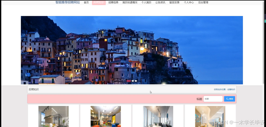 智能推荐招聘网站,在网站的首页可以查看首页、应聘知识、招聘信息、简历投递情况、个人简历、公告资讯、留言反馈、个人中心、后台管理等信息进行详细操作,如图5-1所示。