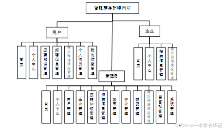 这些功能可以充分满足智能推荐招聘网站的需求。此系统功能较为全面如下图系统功能结构如图4-3所示。