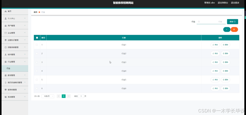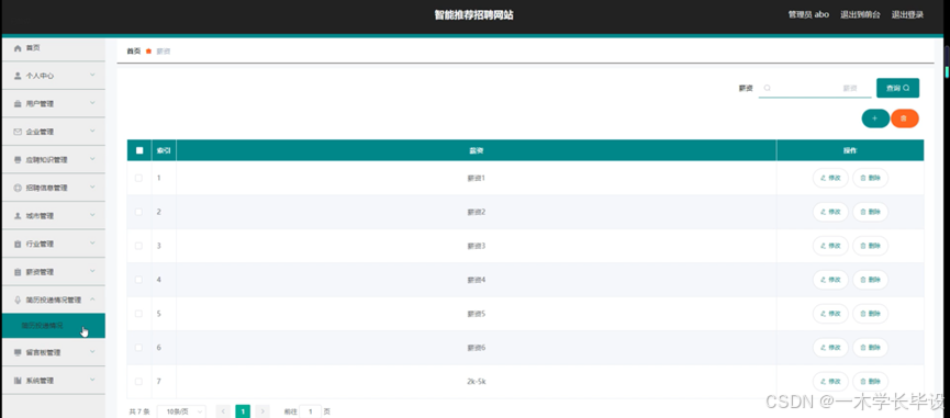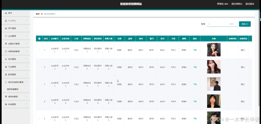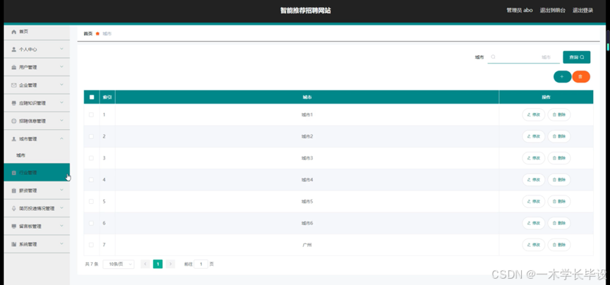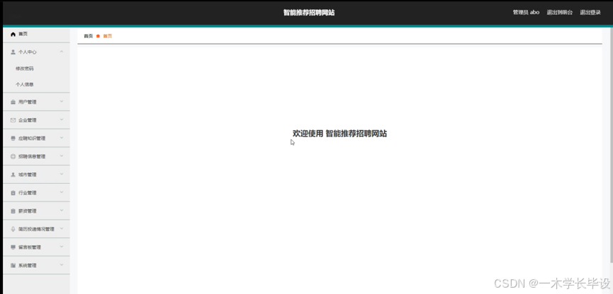 模块包括首页、个人中心、用户管理、企业管理、应聘知识管理、招聘信息管理、城市管理、行业管理、薪资管理、简历投递情况管理、留言板管理、系统管理等进行相应的操作。