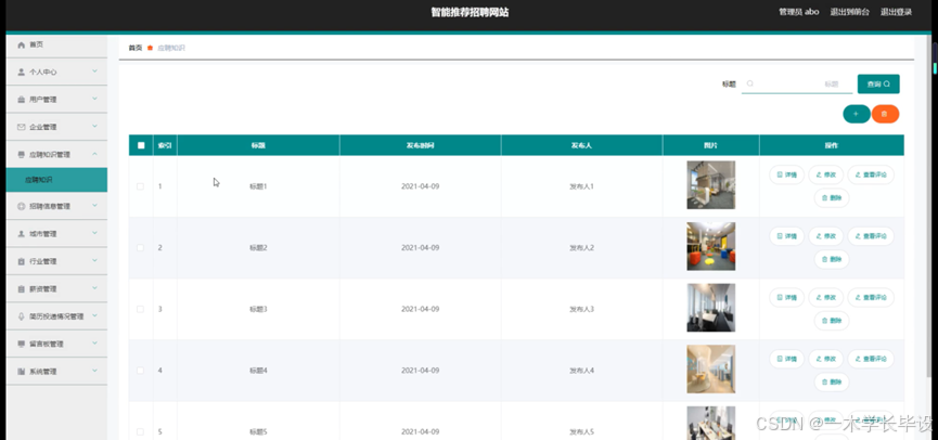 应聘知识管理,在应聘知识管理页面中可以对索引、标题、发布日期、发布人、图片等信息进行详情、修改、查看评论或删除等操作,如图5-10所示。