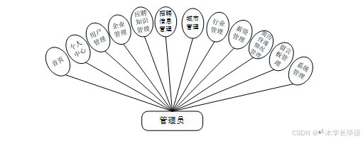 管理员登录后可进行首页、个人中心、用户管理、企业管理、应聘知识管理、招聘信息管理、城市管理、行业管理、薪资管理、简历投递情况管理、留言板管理、系统管理,管理员用例如图3-1所示。