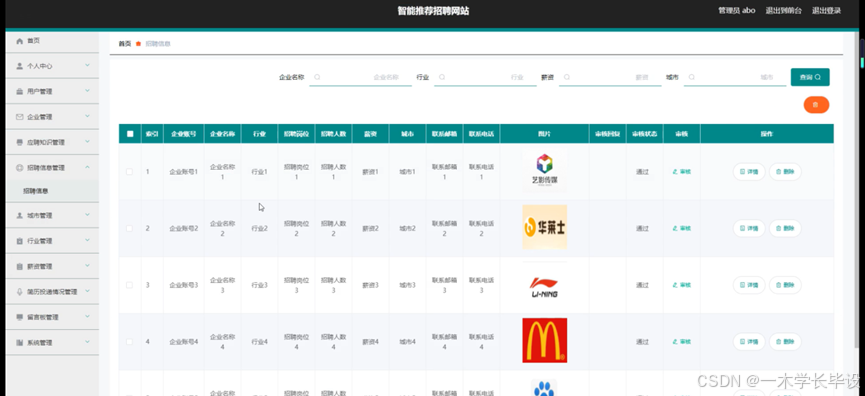 招聘信息管理:管理员可以添加、修改、删除招聘信息,包括企业名称、岗位、薪资、要求等。