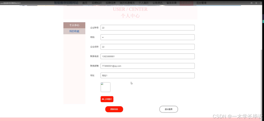 个人中心,在个人中心页面通过填写企业账号、密码、企业名称、联系电话、联系邮箱、地址、上传图片等信息进行更新信息,根据需要我的收藏等进行详细操作,如图5-5所示。