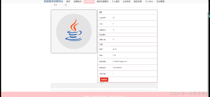 招聘信息,在招聘信息页面中可以查看企业名称、企业账号、图片、行业、招聘岗位、职位要求、招聘人数、待遇、薪资、城市、联系邮箱、联系电话、点击次数等信息,根据需要进行投递简历;如图5-2所示。