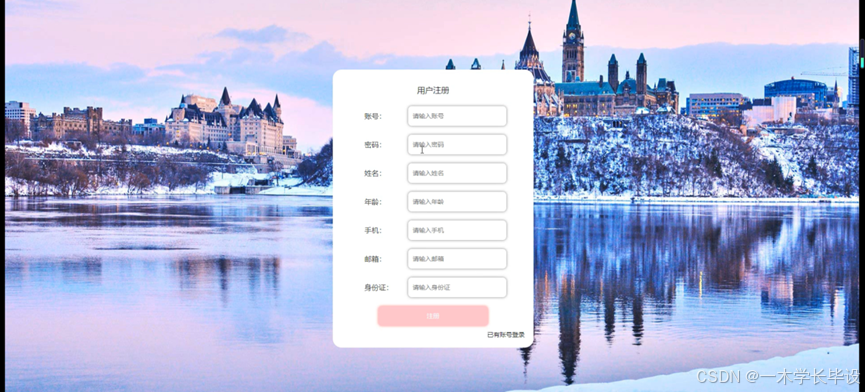 用户注册,在用户注册页面通过填写账号、密码、姓名、年龄、手机、邮箱、身份证等信息完成注册,如图5-6所示。