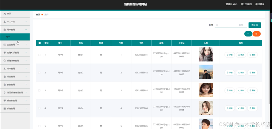 用户管理,在用户管理页面中可以对索引、账号、姓名、性别、年龄、手机、邮箱、身份证、头像等信息进行详情,修改或删除等操作,如图5-9所示。
