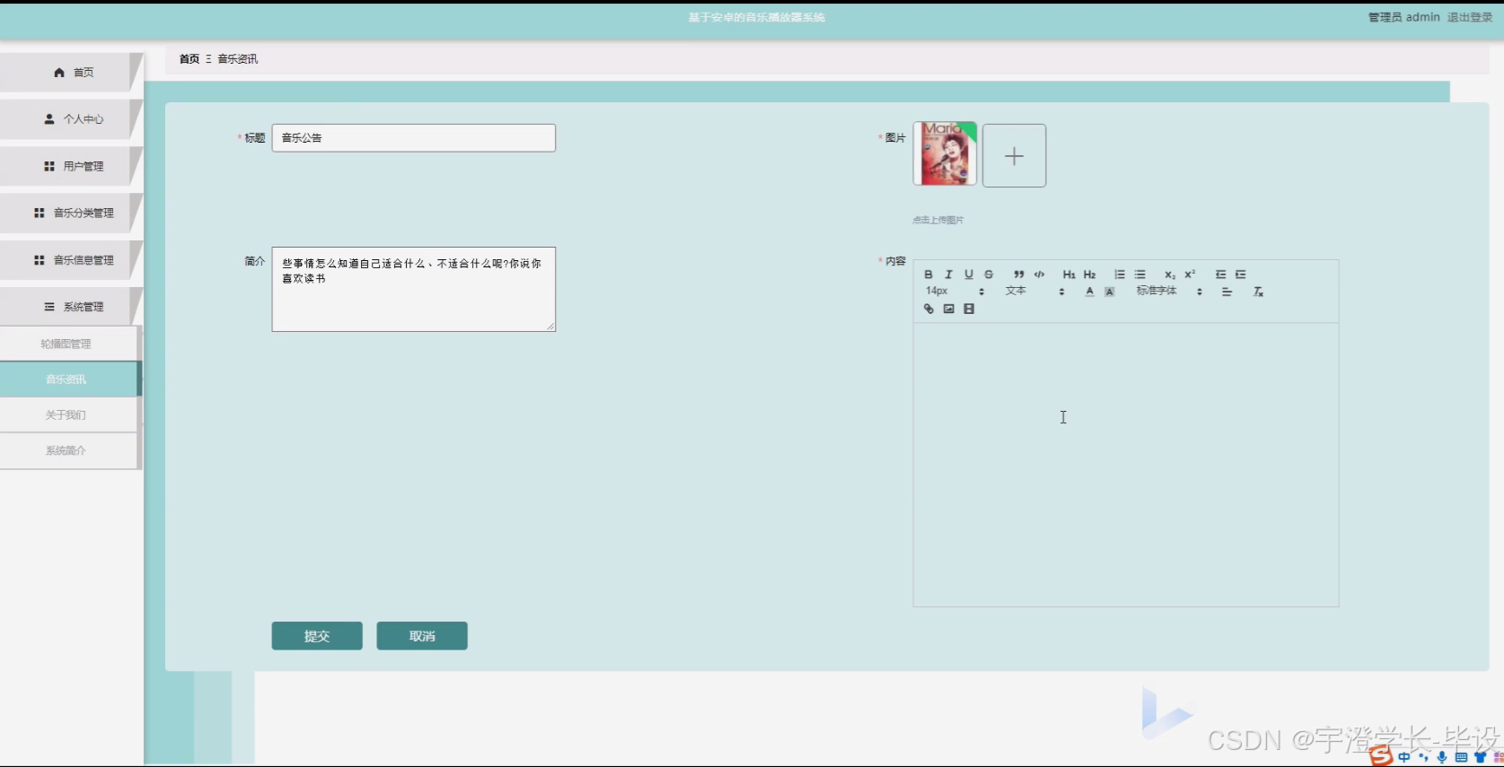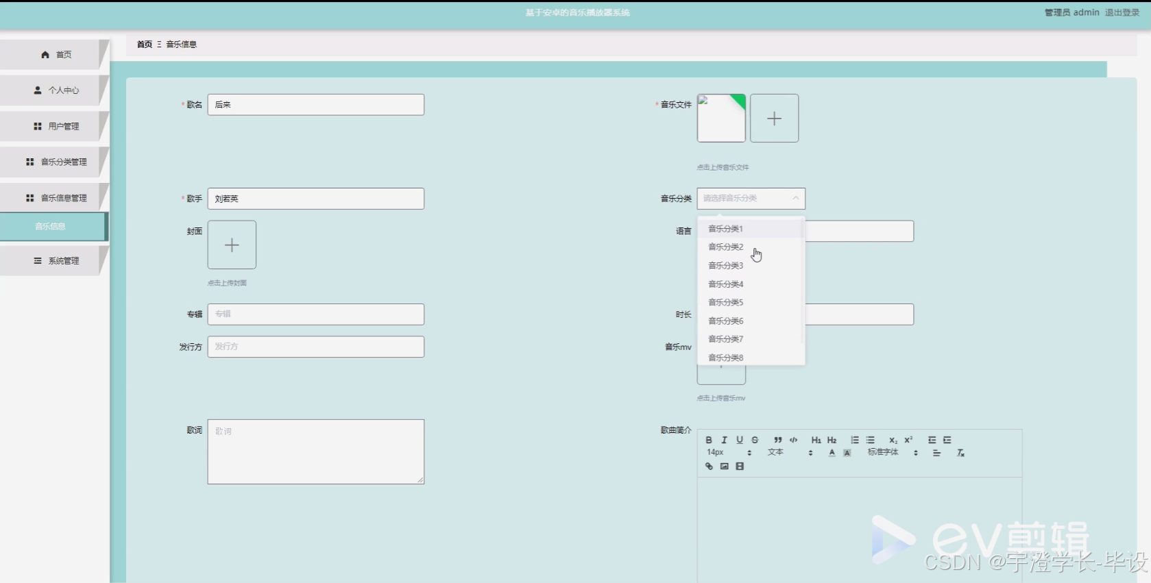 音乐播放器系统的研究内容涵盖了多个关键功能模块,包括用户管理、音乐分类管理、音乐信息管理、音乐排行榜、音乐视频播放等。用户管理模块负责用户的注册、登录、个人信息管理等功能,确保系统的安全性和易用性。音乐分类管理模块根据音乐的类型和风格进行科学合理的分类,便于用户快速检索和浏览。音乐信息管理模块则负责音乐的展示、播放、下载等功能,确保音乐信息的准确性和完整性。音乐排行榜模块根据音乐的热度、评价等数据进行排名,为用户提供热门音乐的参考。音乐视频播放模块则支持用户观看与音乐相关的视频内容,如MV、现场演出等,丰富用户的音乐体验。