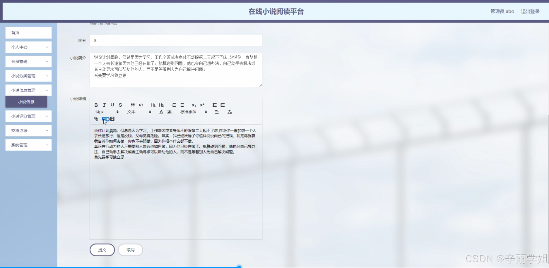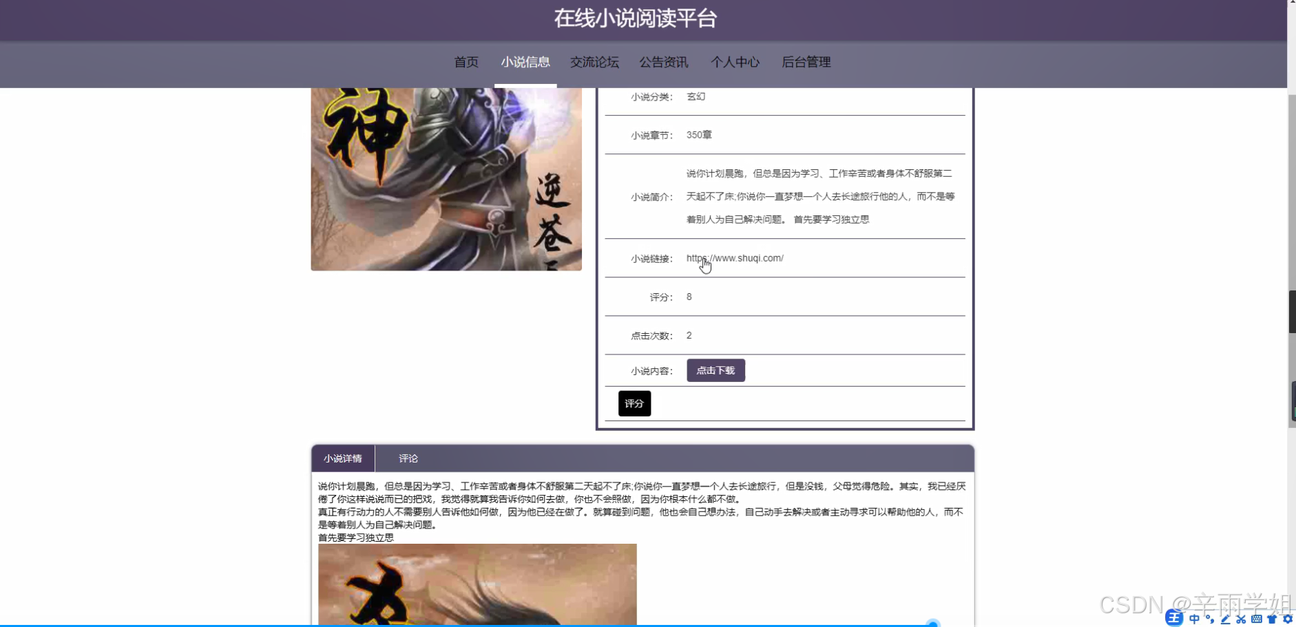 小说信息管理:研究如何管理和展示小说的基本信息,如标题、作者、简介、封面图片等。同时,系统应支持小说的连载和更新,使用户能够及时了解到最新的章节内容。