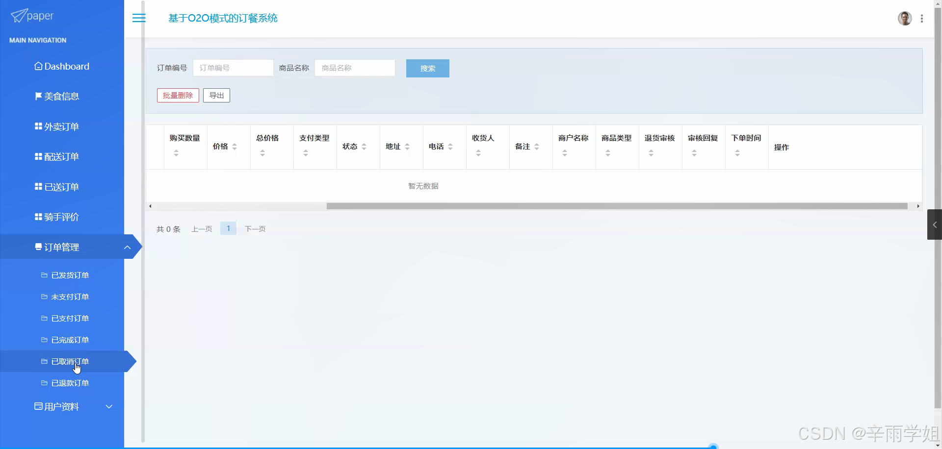 本研究旨在构建一个高效、便捷、功能完善的基于O2O模式的订餐系统。通过深入分析用户需求,整合美食类型资源,优化商家管理,完善骑手配送流程等方面,提升整个订餐系统的服务质量。具体而言,要实现用户的便捷点餐体验,包括快速查找美食类型、下单、查看订单状态等;保障商家能够准确接收订单、处理订单并及时更新美食信息;确保骑手能够高效配送订单,同时建立合理的骑手评价机制,以激励骑手提高服务质量。