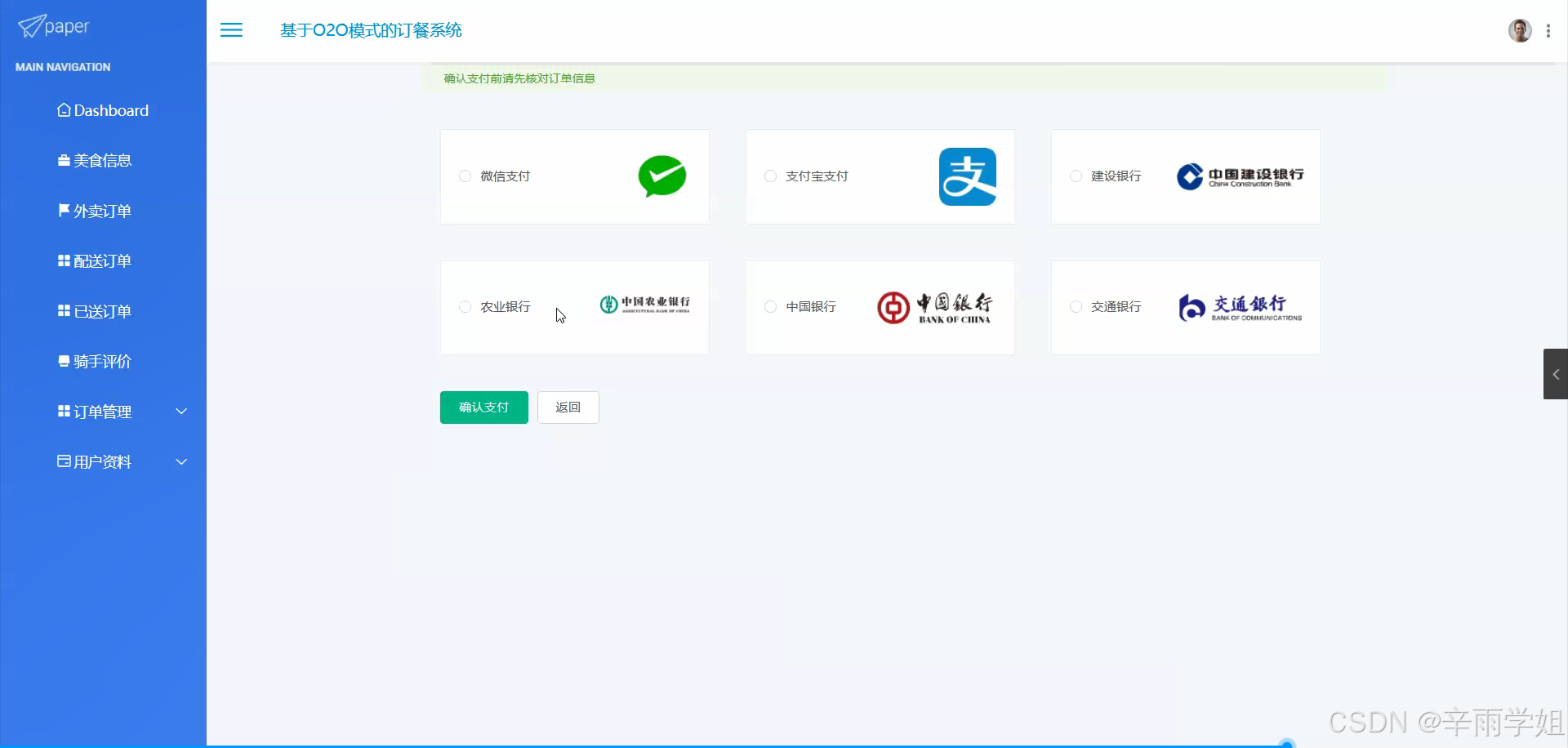 - 构建完整的订餐系统:开发出一个功能齐全、运行稳定的基于O2O模式的订餐系统,包括用户、商家、骑手等各端的功能实现。例如,用户端实现便捷点餐、订单跟踪、评价等功能;商家端实现订单管理、美食信息更新、顾客反馈处理等功能;骑手端实现接单、配送导航、订单完成确认等功能。