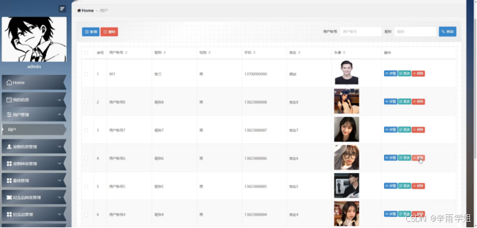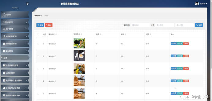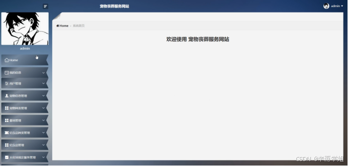 管理员进入主页面,主要功能包括对我的信息、用户管理、宠物信息管理、宠物种类管理、墓地管理、纪念品种类管理、纪念品管理、火化场预定服务管理、火化服务记录管理、宠物清洗服务管理、告别仪式准备服务管理、清洗服务记录管理、告别仪式服务记录管理、电子灵堂管理、用户反馈、系统管理、订单管理等进行操作。管理员主页面如图5-7所示: