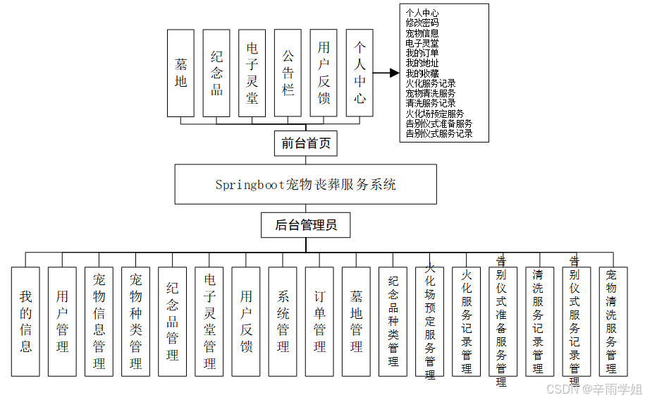 宠物丧葬服务网站按照权限的类型进行划分,分为用户和管理员两个模块。用户模块主要实现个人中心、修改密码、我的收藏等操作,增强了用户的操作体验。管理员模块主要针对整个系统的管理进行设计,提高了管理的效率和标准。系统的总体模块设计如下图所示:
