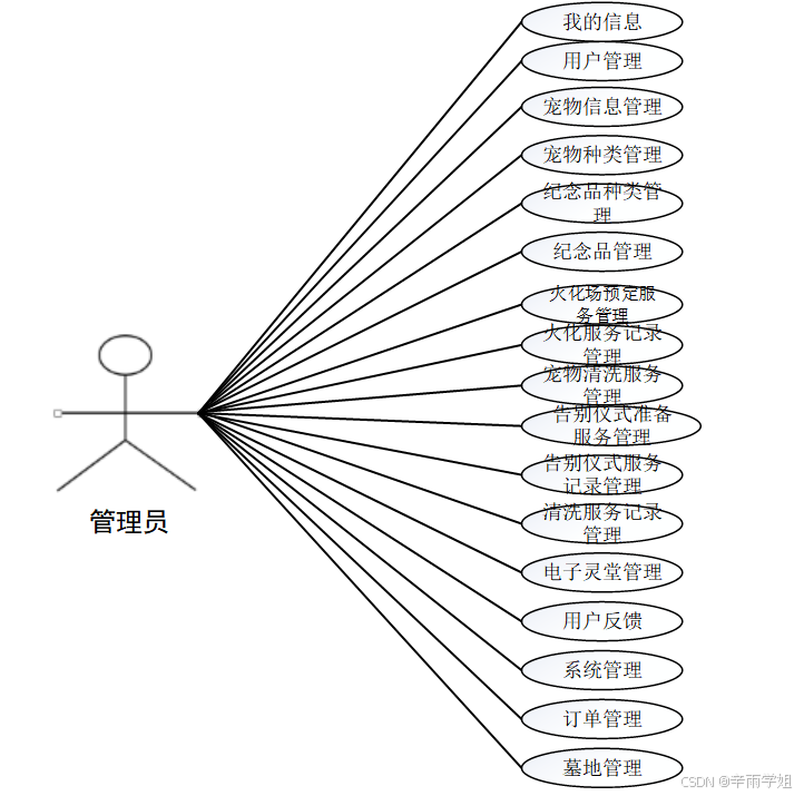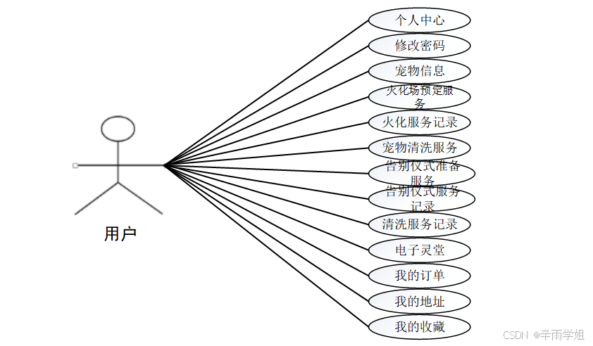 (1)、用户关键功能包含个人中心、修改密码、宠物信息、火化场预定服务、火化服务记录、宠物清洗服务、告别仪式准备服务、清洗服务记录、告别仪式服务记录、电子灵堂、我的订单、我的地址、我的收藏等进行操作管理。用户用例如下: