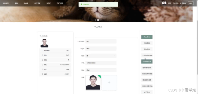 个人中心:在个人中心页面可以对个人中心、修改密码、宠物信息、火化场预定服务、火化服务记录、宠物清洗服务、告别仪式准备服务、清洗服务记录、告别仪式服务记录、电子灵堂、我的订单、我的地址、我的收藏等功能进行操作;如图5-5所示: