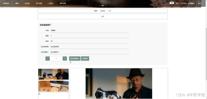 纪念品:在纪念品页面的输入栏中输入纪念品名称、价格进行查询,可以查看到纪念品详细信息,并根据需要进行添加到购物车、立即购买操作;纪念品页面如图5-4所示: