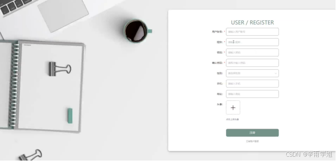 在注册流程中,用户在Vue前端填写必要信息(如用户名、密码等)并提交。前端将这些信息通过HTTP请求发送到Java后端。后端处理这些信息,检查用户名是否唯一,并将新用户数据存入MySQL数据库。完成后,后端向前端发送注册成功的确认,前端随后通知用户完成注册。这个过程实现了新用户的数据收集、验证和存储。注册页面如图5-2所示: