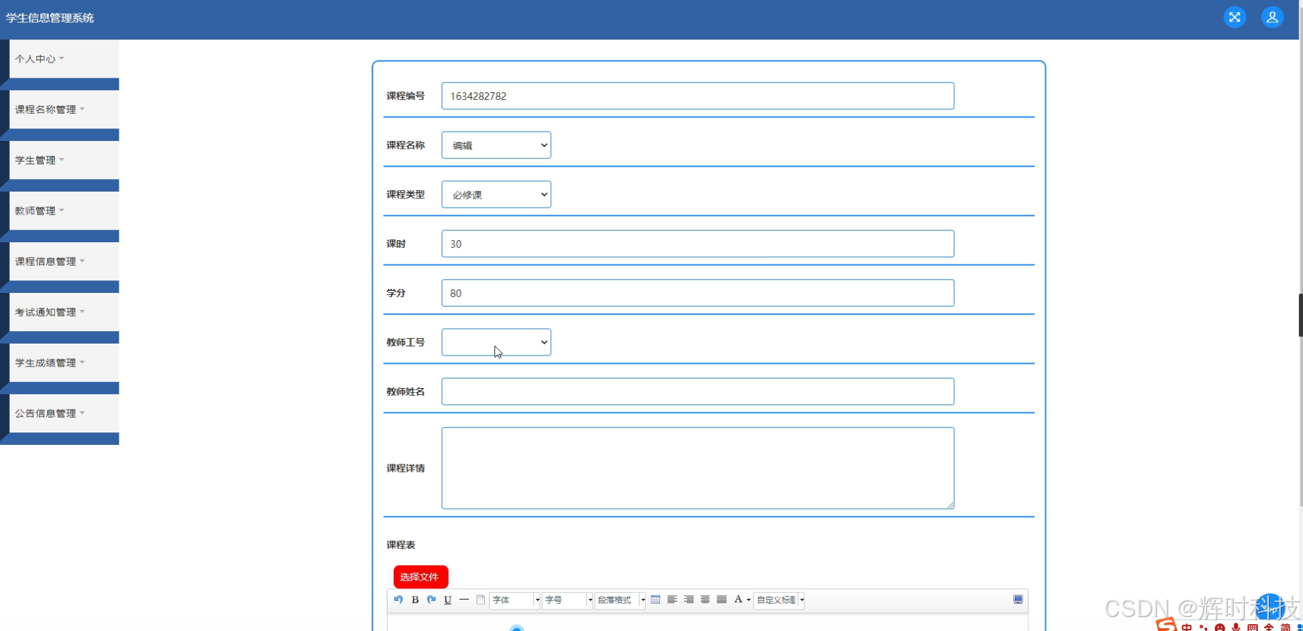 - 课程基本信息的录入,如课程名称、课程代码、课程学分、课程类型(必修、选修)等。