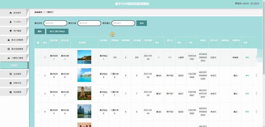 门票预订管理:管理员点击门票预订管理。在门票预订页面输入景点名称、景点分类和选择是否通过进行查询或删除门票预订列表,进行每日门票订单统计,并根据需要对门票预订详细信息进行详情、修改或删除操作。门票预订管理界面如图5-11所示: