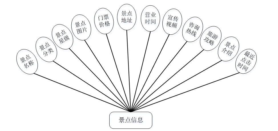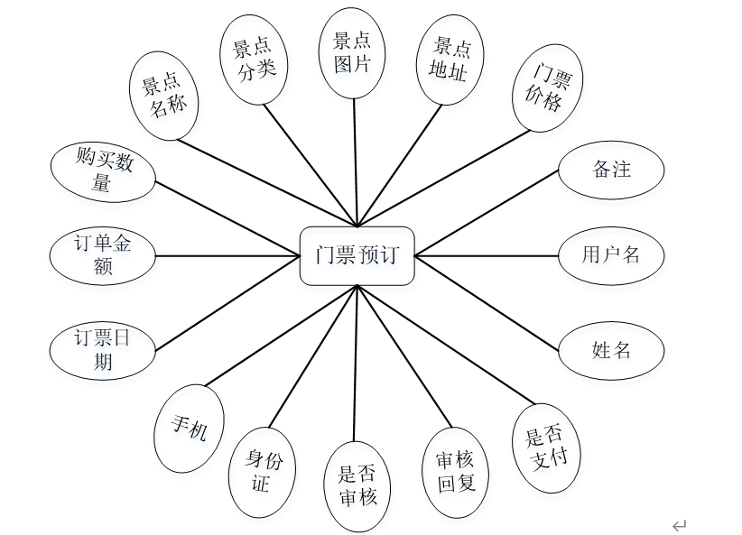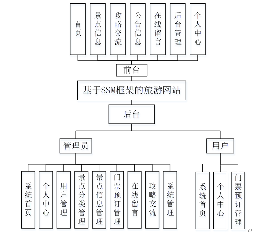 该系统分为管理员与用户两类角色功能,用户端(B/S 端)包含注册登录模块,支持凭用户名(绑定姓名、性别、手机号、身份证、头像)注册与安全登录;个人中心模块,更新个人信息(密码、联系方式),管理我的发布(攻略帖子)、我的收藏(收藏景点 / 攻略);景点信息模块,按景点名称、星级、地址查询景点(分类、图片、门票价格、营业时间、咨询热线、介绍、攻略),进行收藏、门票预订、评论操作;门票预订模块,提交预订申请(景点、数量、日期、身份证),查看预订状态(待审核 / 已支付);攻略交流模块,发布旅游攻略(标题、内容),回复他人攻略;公告信息模块,浏览旅游公告(标题、简介、内容、图片);在线留言模块,提交咨询(内容、图片),接收管理员回复。管理员端包含系统首页、个人中心,维护管理员信息;用户管理模块,查询、新增、修改用户账号(用户名、姓名、联系方式、身份证);景点分类管理模块,维护景点分类(如自然风光、历史文化、休闲度假);景点信息管理模块,录入景点信息(名称、分类、星级、图片、门票、地址、营业时间、介绍),管理景点评论;门票预订管理模块,审核用户预订申请,统计每日订单,处理支付状态;在线留言模块,回复用户咨询,删除违规留言;攻略交流管理模块,管理用户攻略(删除违规内容、推荐优质攻略);系统管理模块,维护公告信息(发布旅游通知)、轮播图(首页推荐景点)、关于我们(平台介绍)。系统通过景点信息表、门票预订表、用户表等数据库表实现数据存储,覆盖从景点查询到门票预订的全流程,满足旅游网站信息化需求。