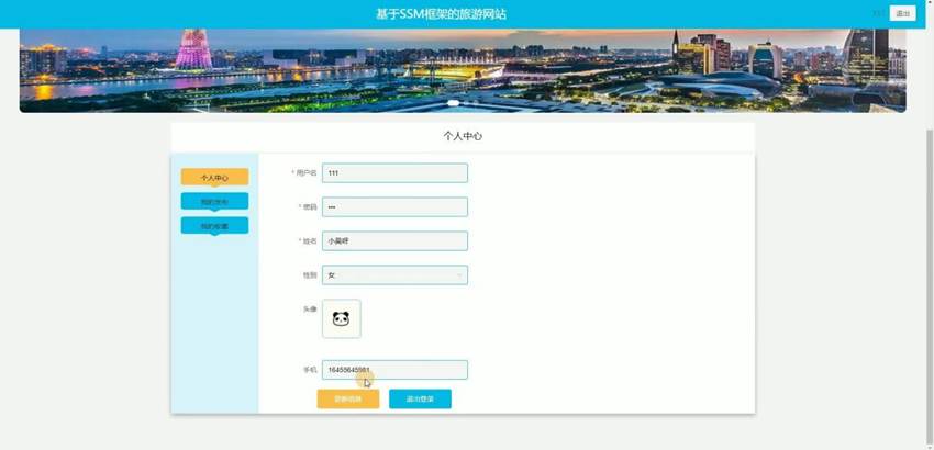 个人中心:在个人中心页面通过填写个人详细信息进行更新操作,还可以对我的发布和我的收藏进行详细操作;如图5-5所示: