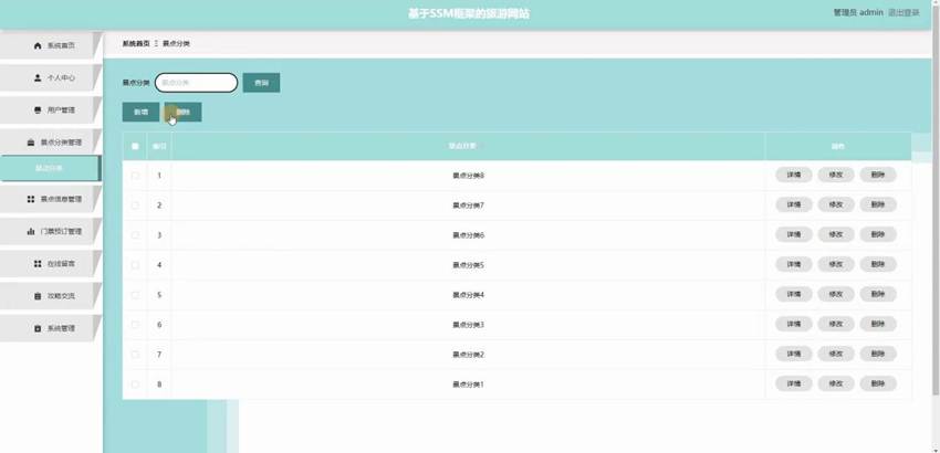 景点分类管理:管理员点击景点分类管理。在景点分类页面输入景点分类进行查询、新增或删除景点分类列表,并根据需要对景点分类详细信息进行详情、修改或删除操作。景点分类管理界面如图5-9所示: