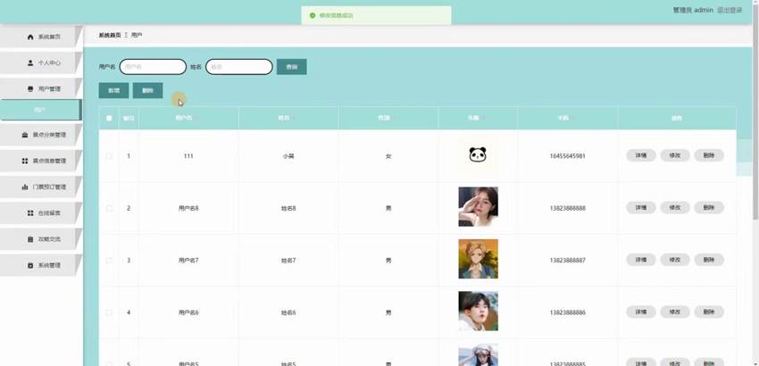 用户管理:管理员点击用户管理。进入用户页面输入用户名和姓名进行查询、新增或删除用户列表,并根据需要对用户详细信息进行详情、修改或删除操作。用户管理界面如图5-8所示: