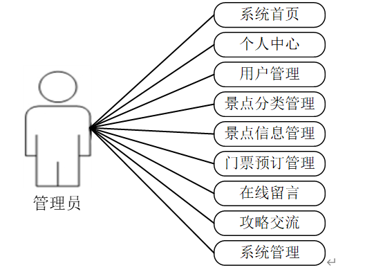 (2)管理员可以对系统首页、个人中心、用户管理、景点分类管理、景点信息管理、门票预订管理、在线留言、攻略交流、系统管理等进行基本的信息管理。其用例分析如图3-5所示。