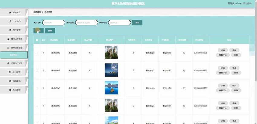 景点信息管理:管理员点击景点信息管理。在景点信息页面输入景点名称,选择景点星级,输入景点地址进行查询、新增或删除景点信息列表,并根据需要对景点详细信息进行详情、修改、查看评论或删除操作。景点信息管理界面如图5-10所示: