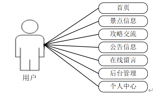 (3) 用户进入网站可以实现对首页、景点信息、攻略交流、公告信息、在线留言、后台管理、个人中心等进行操作,用例分析如图3-6所示。