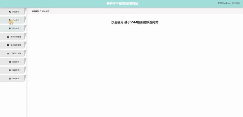 管理员进入主页面,主要功能包括对系统首页、个人中心、用户管理、景点分类管理、景点信息管理、门票预订管理、在线留言、攻略交流、系统管理等进行操作。管理员主界面如图5-7所示:
