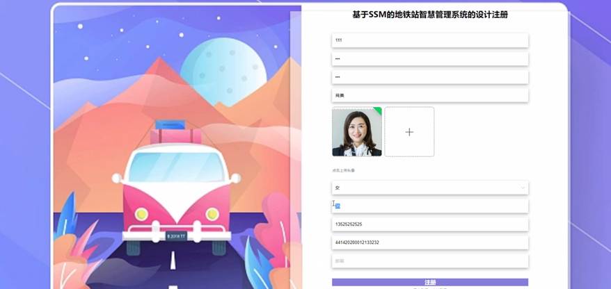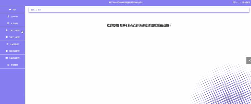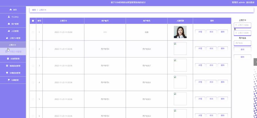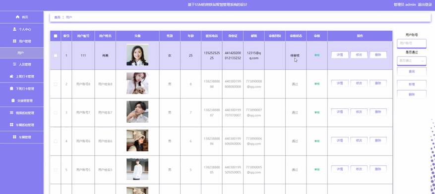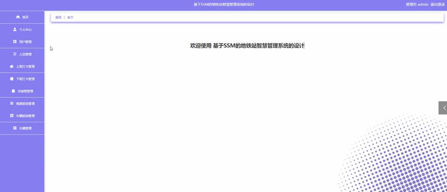 该系统以 Java 为开发语言,基于 SSM 框架构建后端,搭配 MySQL 数据库存储数据,实现地铁站管理从人工操作到数字化协同的全流程升级。核心功能涵盖两类角色需求:登录注册模块,支持管理员与用户(地铁站工作人员)账号注册登录,用户绑定账号、姓名、身份证、联系方式,管理员绑定超级权限账号;个人中心模块,两类角色均可更新个人信息(密码、联系方式、头像),用户管理考勤与巡检记录,管理员统筹全局管理;管理员模块,统筹系统全局管理: